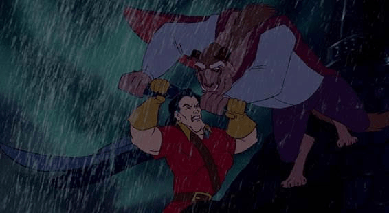 Quando Gaston e Fera se encontram acontece a icônica batalha final em um cenário escuro e chuvoso, como no dia em que a feiticeira amaldiçoou o arrogante príncipe. Diferentemente do passado, a Fera se mostra misericordiosa ao poupar a vida de Gaston após vencê-lo na luta, mostrando que realmente mudou. Por outro lado, Gaston mostra seu lado traiçoeiro e tenta atacar a Fera pelas costas, mas acaba se desequilibrando e caindo do castelo.