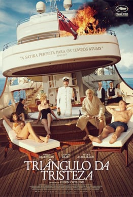 Em ‘Triângulo da tristeza’ (título que se explica nos primeiros 20 minutos), vemos um grupo variado de gente muito rica (não necessariamente refinada, já que o dinheiro veio de várias formas, e não compra nobreza) que fazem uma viagem num cruzeiro de luxo, onde todos os seus desejos são atendidos prontamente. Por exemplo: alguém lá gosta de Nutella, que falta no navio, e logo um helicóptero traz o produto a bordo (!). Quebrando o padrão, está um casal de jovens influencers (ambos, modelos), que ganharam a estadia em troca de promoção. Não são ricos, mas vivem como se fossem.
