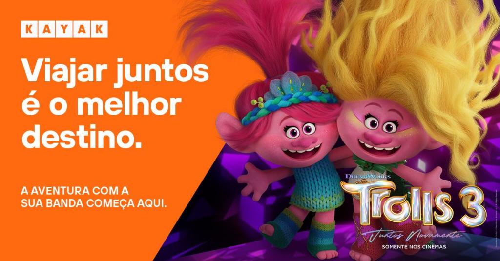 Com as férias de final de ano no radar, a DreamWorks Animation convida a todos para acompanhar uma história repleta de ação, lugares deslumbrantes e com as cores do arco-íris, como nenhuma outra. Com um elenco de super estrelas musicais e potências da comédia, o novo capítulo da franquia apresenta a bomba de alegria psicodélica exclusiva dos Trolls com novos sucessos pop e grandes clássicos, onde todos poderão se juntar a Branch e Poppy enquanto eles embarcam em uma jornada emocional para reunir e resgatar sua família de um destino ainda pior do que a obscuridade da cultura pop. Inclusive, a nova aventura promete instigar o planejamento de uma nova viagem. “O universo do entretenimento e o de viagens, sem dúvidas, são complementares. Filmes e séries, muitas vezes, instigam o desejo de viajar, apresentam novos cenários e oportunidades. Por isso essa parceria faz tanto sentido para nós”, comenta Carolina Montenegro, General Manager e Vice Presidente do KAYAK na Europa e América Latina.