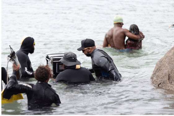 Bastidores de uma das cenas realizadas na água pelo ator Ronald Sotto e Lara Tremouroux. Créditos: Divulgação