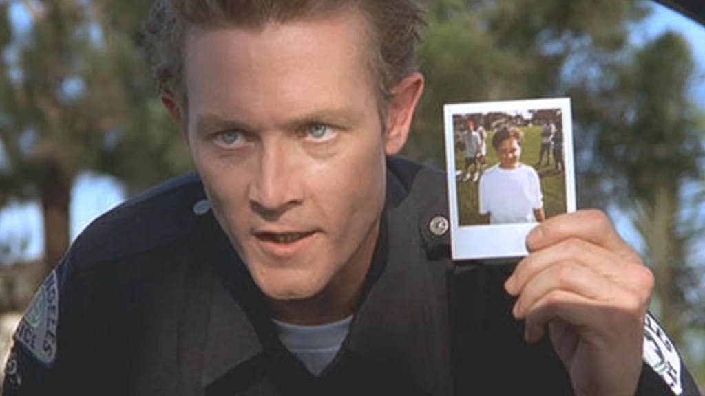 Neste momento podemos ver que o policial é o ator Robert Patrick, vestido da mesma maneira que o T-1000, o robô de metal líquido enviado ao passado para matar John Connor, o líder da resistência humana contra as máquinas, no filme Exterminador do Futuro 2: O Julgamento Final.