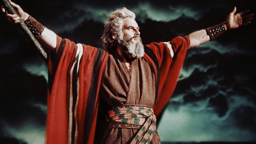 Charlton Heston aparece nesta épica adaptação da passagem de Moisés e os Dez Mandamentos, dirigida por Cecil B. DeMille. A produção possui quase quatro horas de duração e a cena da abertura do Mar Vermelho entrou para a história do cinema e como uma das mais impressionantes até então.