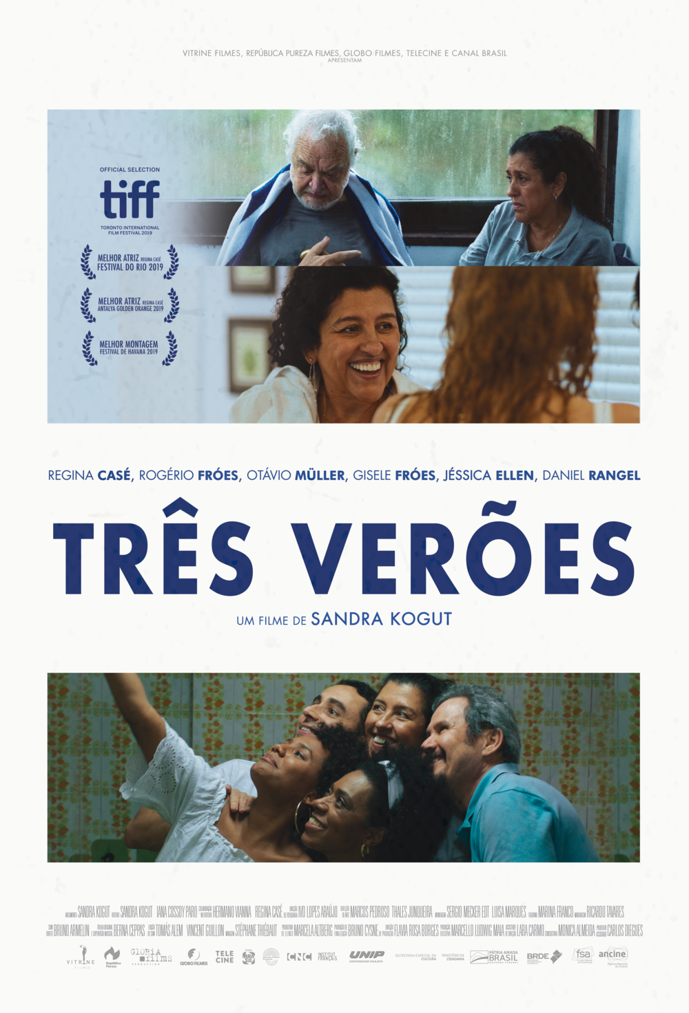 Protagonizado por Regina Casé, o elenco conta com Rogério Fróes, Otávio Müller e Gisele Fróes, Jessica Ellen completam o elenco do filme Carla Ribas, Carol Pismel, Wilma Melo, Luciano Vidigal e Daniel Rangel. TRÊS VERÕES é produzido pela República Pureza, em coprodução com a Gloria Films, Globo Filmes, Telecine e Canal Brasil, apoio cultural da UNIP e distribuição no Brasil é da Vitrine Filmes.